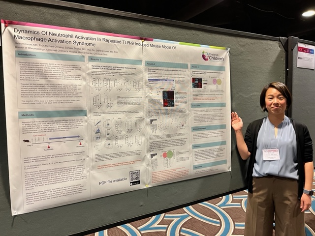 まず最初に留学に至るまでの経緯ですが、夫が留学を決めたのが最初です。私はそれまでずっと北陸から出たことすらなく、自ら動いて留学へ行こうとは考えていませんでした。夫(循環器内科医)が学位取得ごろから留学を考えはじめ、CCHMCに留学先を見つけました。留学に行くなら家族で一緒に行くことは決めていたものの、自分も仕事をするのかどうかは当初曖昧でした。が、せっかくシンシナティに行くのならリウマチ科に関わりに行きたい!と思ったわけです。ご縁をいただき、Grant Schulert先生とのやりとりの末、半年ほど主婦生活を経て2021年10月から仕事を始めることができました。アメリカでの医師免許を持っていないため研究に集中していますが、著名な先生方と身近にディスカッションできたりする環境は、貴重でありがたいものです。